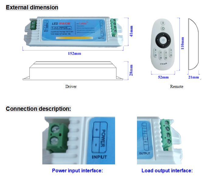This 4 zone 2.4G RF color temperature controller adopt the press button RF wireless remote control, can adjust to change the lights color temperature according to the customer’s preference. 2.4G frequency make it more stable and more strong anti-jamming capability to use.