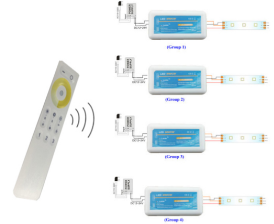Remark:a remote control can operate 3 groups of controllers at the same time. each group of controllers can be composed of many controllers, such as 30 controller divided the 3 groups, then, each group control can remote 10 controllers, to achieve synchronously adjustable brightness effect.