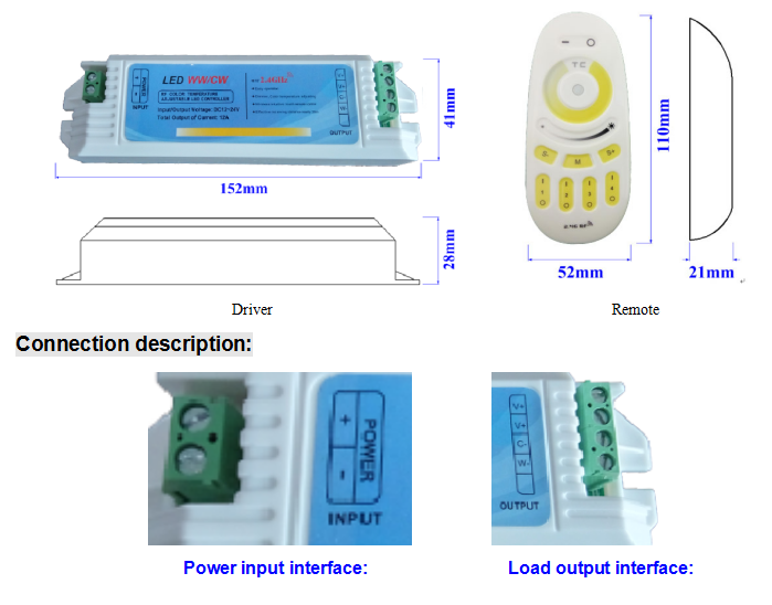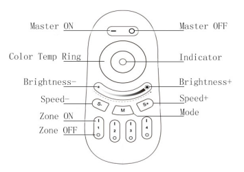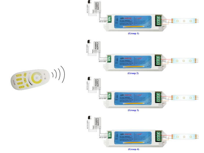 This 4 zone 2.4G RF color temperature controller adopt the touch RF wireless remote control, can adjust to change the lights color temperature according to the customer’s preference. 2.4G frequency make it more stable and more strong anti-jamming capability to use.