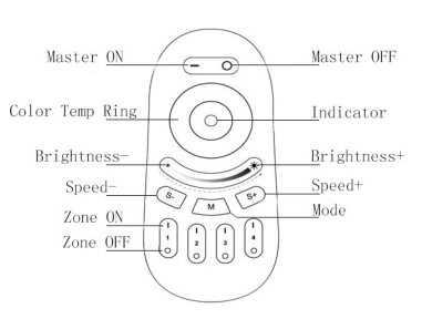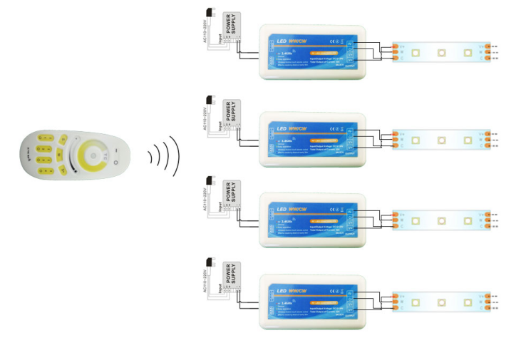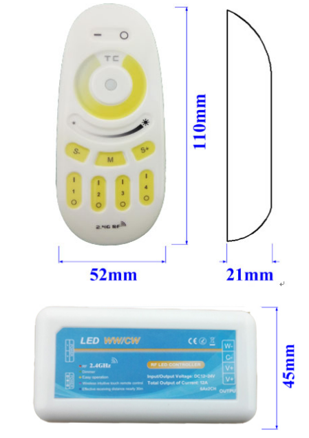 This 4 zone 2.4G RF color temperature Controller is the touch button RF wireless remote controller, the most advanced PWM (pulse width modulation) control technology have been adopted. It can be installed & used easily, plenty modes can be selected, speed & brightness can be adjusted with the remote. It also has memory function because we inside the memory chip on the PCB. With all these high functions, we still make it so tiny, and make it more economical and practical. It’s mainly used to control all kinds of constant voltage led lights, such as: LED source, LED strips, led wall washer, wall Glass curtain lights, etc.