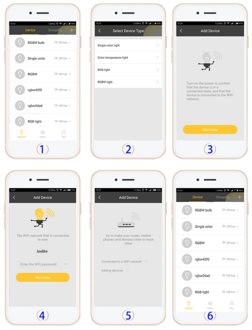4. Click on the top right Conner“+” to add the device, Select the device type of yours, then Click the “Next step”; enter the password of your Wi-Fi Router and “Next Step”.