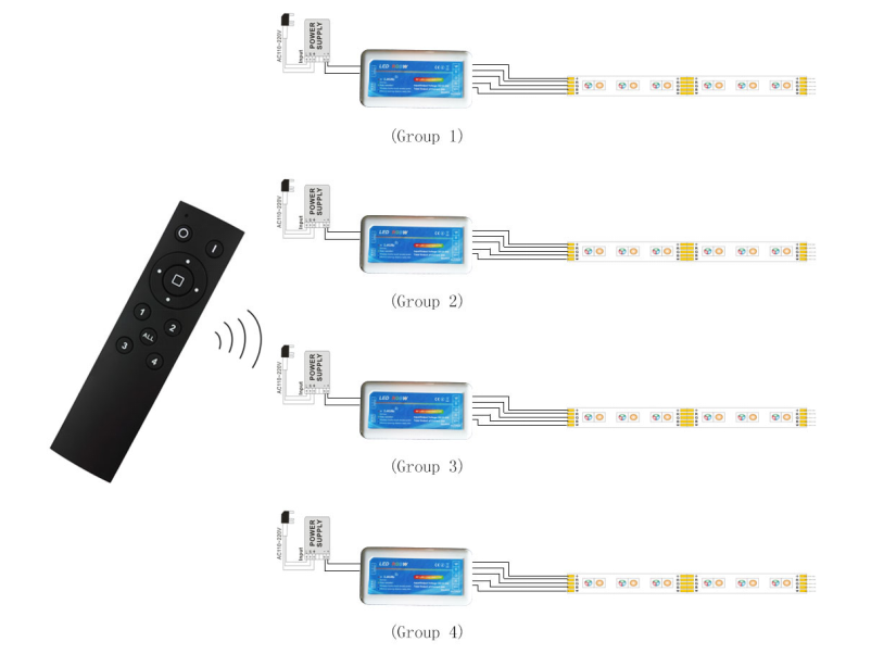 Clean code: if want to change the light control group, can clean the code off. After cleaning code, the remote and receiver will be in the initial state. Operation method: Press the “Group X(X=1,2,3,4) OFF ” Button for 2 seconds within 8 seconds when power the controller, till the output light flash for 9 times, means clean code successfully.