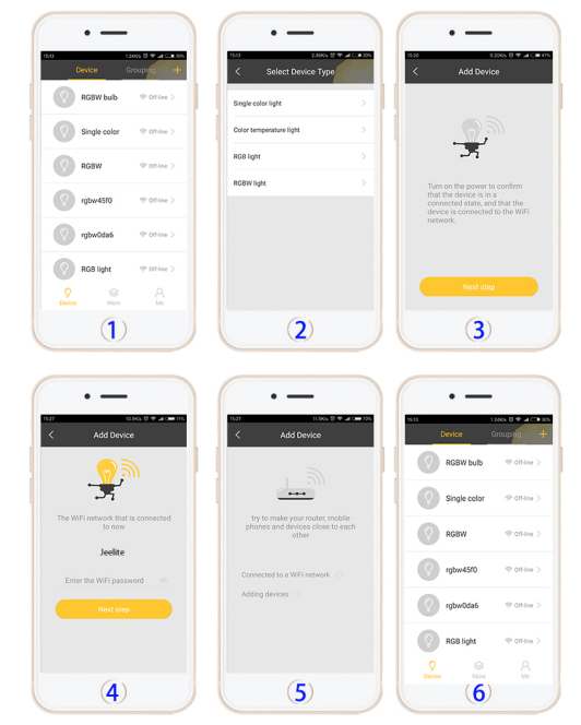 4. Click on the top right Conner“+” to add the device, Select the device type of yours, then Click the “Next step”; enter the password of your Wi-Fi Router and “Next Step”.