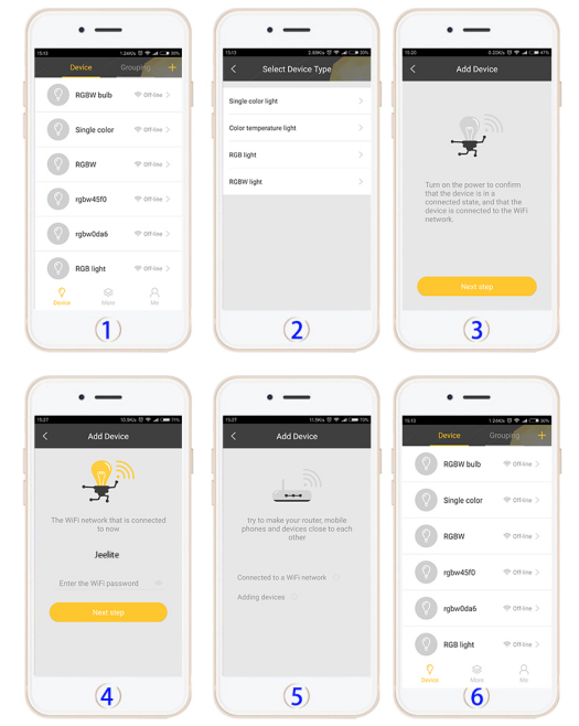 4. Click on the top right Conner“+” to add the device, Select the device type of yours, then Click the “Next step”; enter the password of your Wi-Fi Router and “Next Step”.
