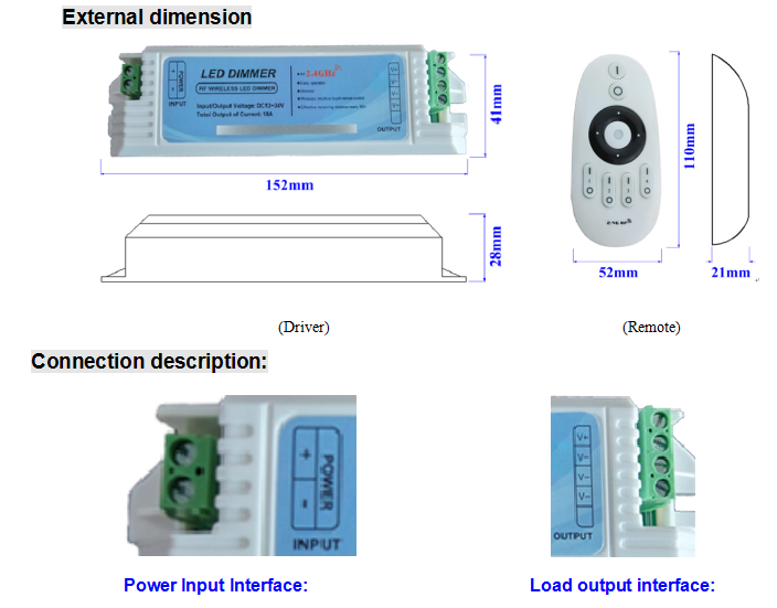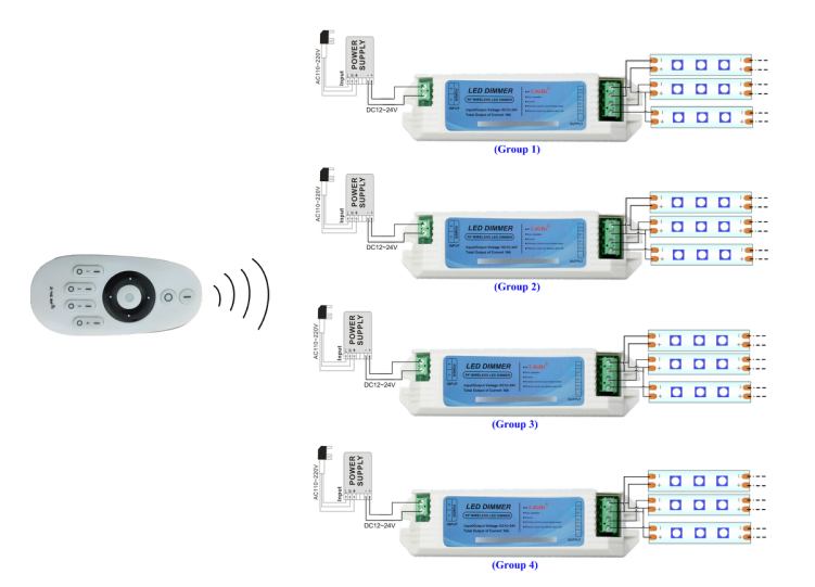 This 4 zone 2.4G RF led dimmer adopt the press button RF wireless remote control,can adjust brightness infinitely to change the lights brightness according to the customer’s preference. 2.4G frequency makes it more stable and more strong anti-jamming capability to use.