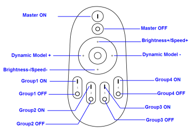 3、Group operate instruction: if there is A and B two piece controller receiver, first to Power the receiver A, then press the “Group 1 ON” button for five times then the led will be flash, this means receiver A is controlled by Group 1. Second to power the receiver B,press the “Group 2 ON” button for five times, than the led will be flash, this means the Receiver B is controlled by Group 2. When press the “Master ON” button, Receiver A and B are turn on at the same time, press the “Master OFF” button, Receiver A and B are turn off at the same time , A and B receiver are changing the same when press the touch color wheel . IF you want to controller receiver A/B separately, please press the “Group 1 ON” button first, than you can adjust Receiver A color temperature or turn ON/OFF receiver A . Meanwhile, Group 2/3/4 are the same.