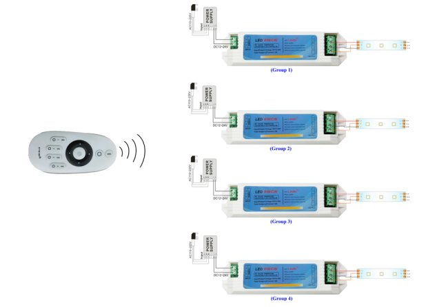 This 4 zone 2.4G RF color temperature controller adopt the press button RF wireless remote control, can adjust to change the lights color temperature according to the customer’s preference. 2.4G frequency make it more stable and more strong anti-jamming capability to use.