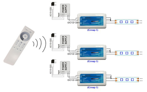 For example: there are A and B controller. Firstly, Switch on the power for A(within 8 seconds)long press “Group 1”button for 1 second, the output led light will be quickly flash. “Group 1” can control A controller.